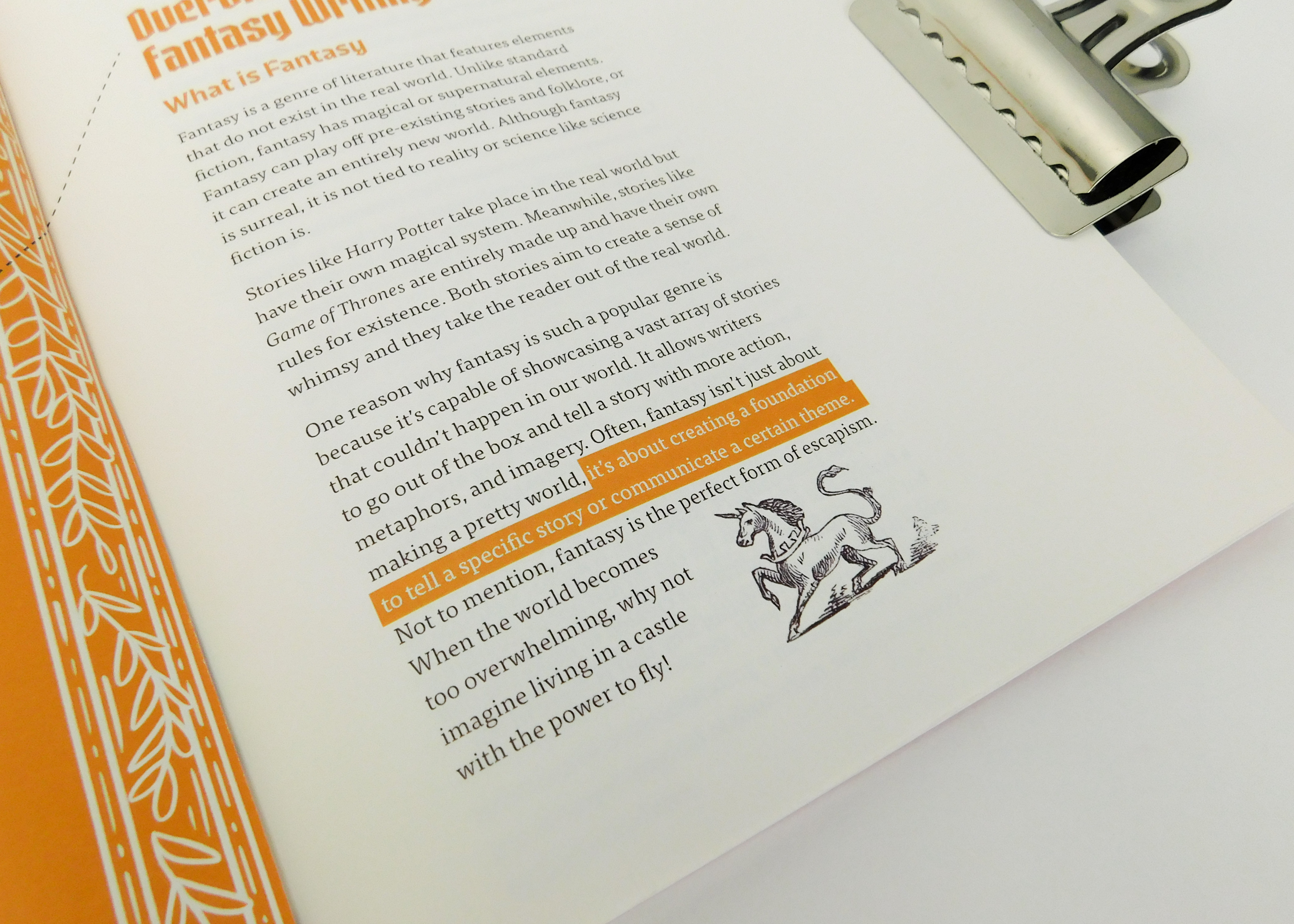 Congrats! You found my senior thesis. Here, I decided to create a book on how to write fantasy. I am a huge fan of the genre, so this guide was a big passion project for me. It spans 87 pages, and it comes with a companion pack of writing prompts.