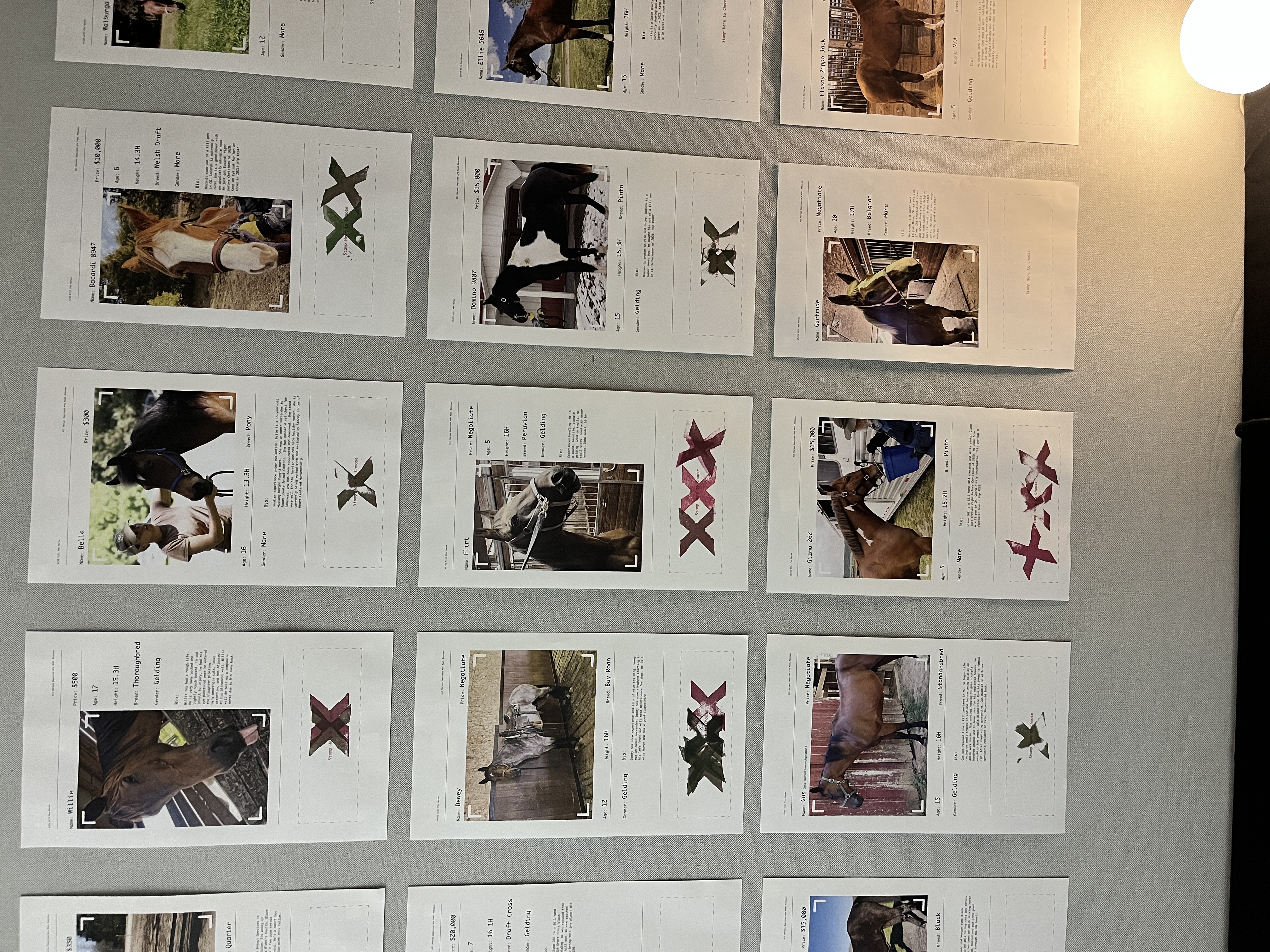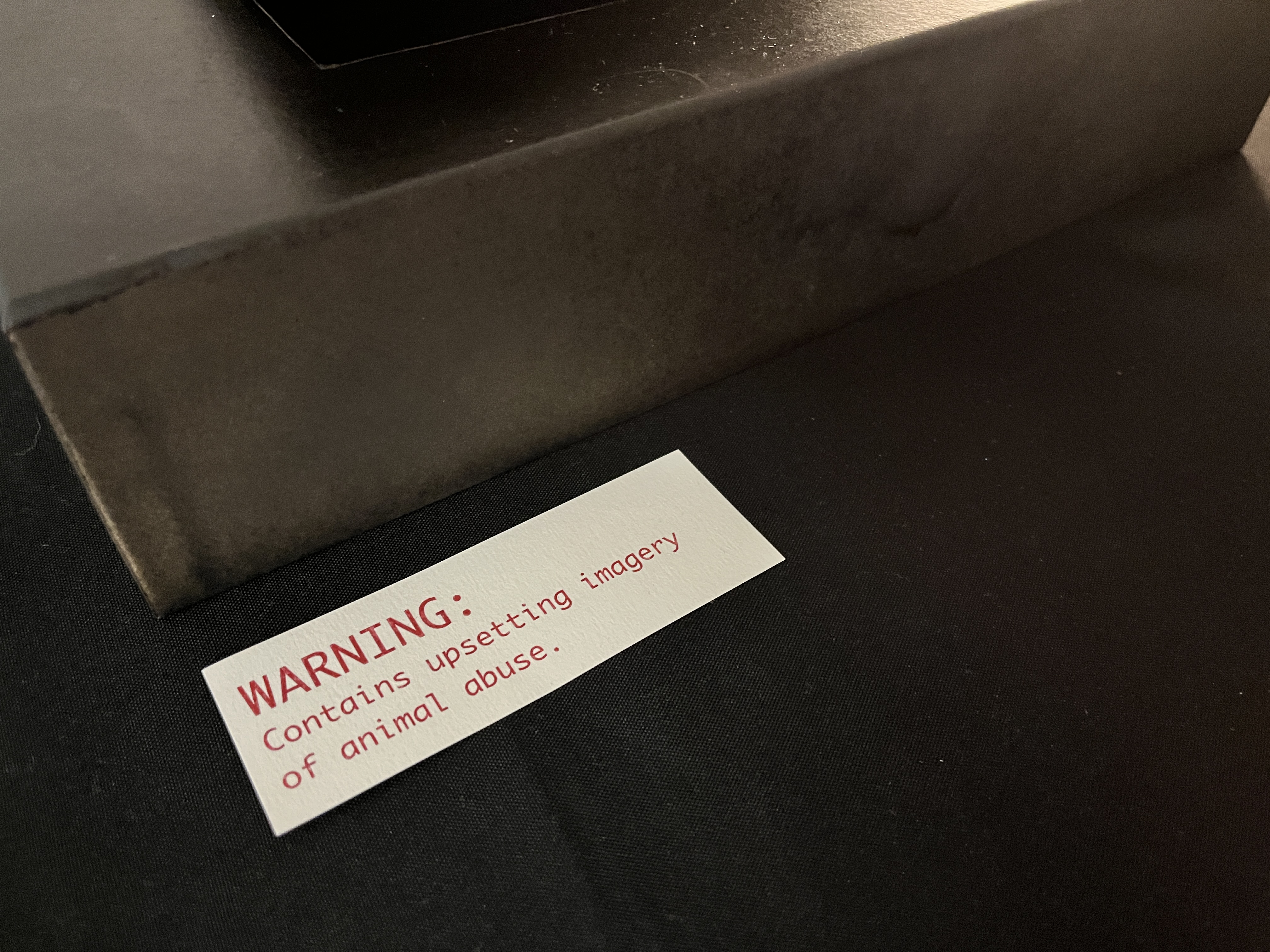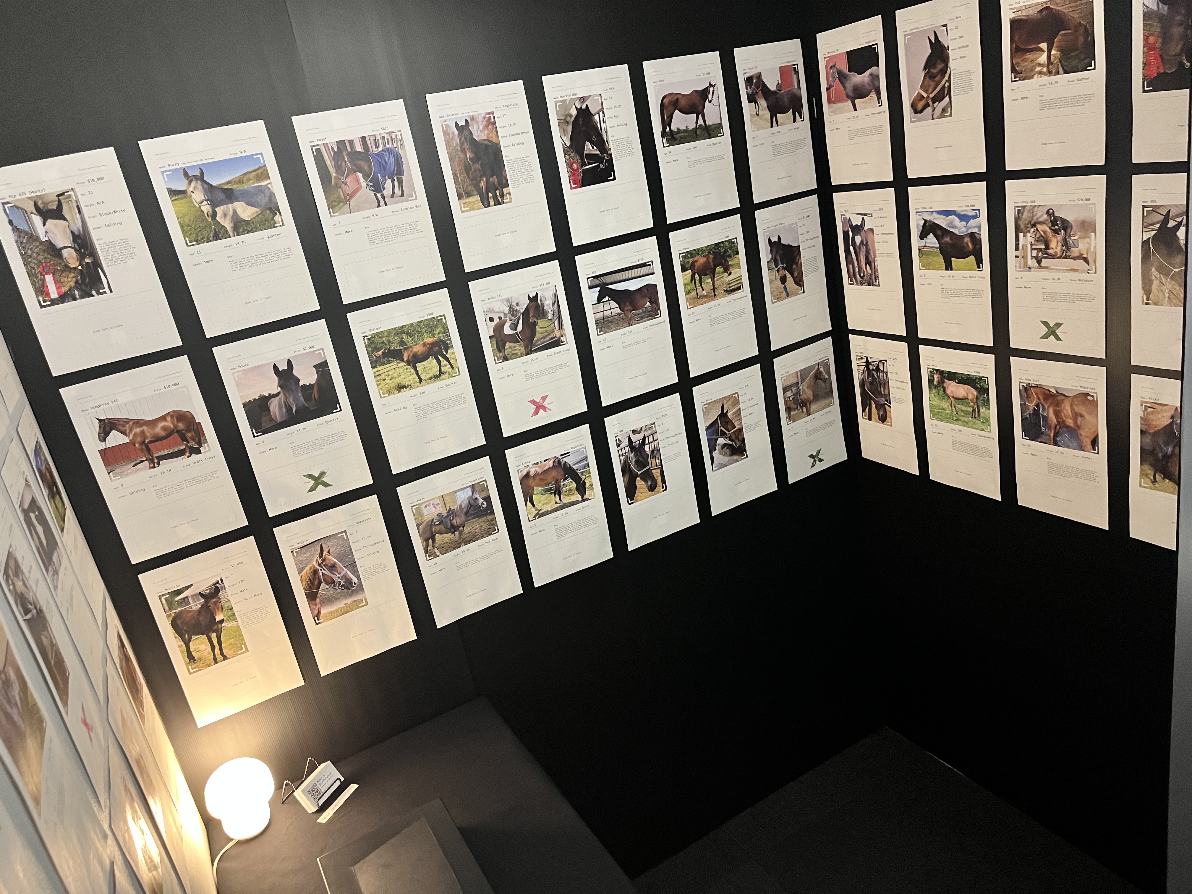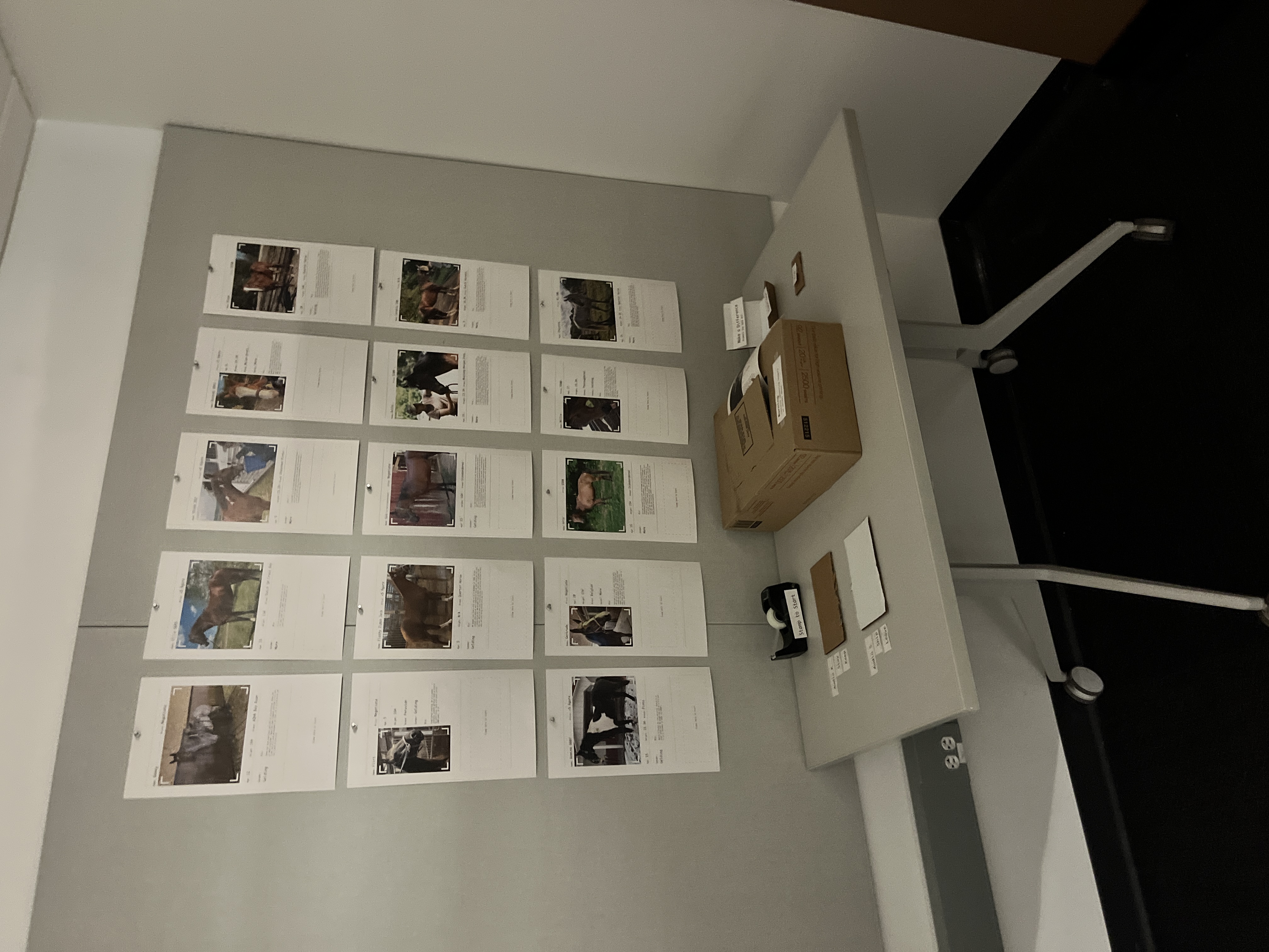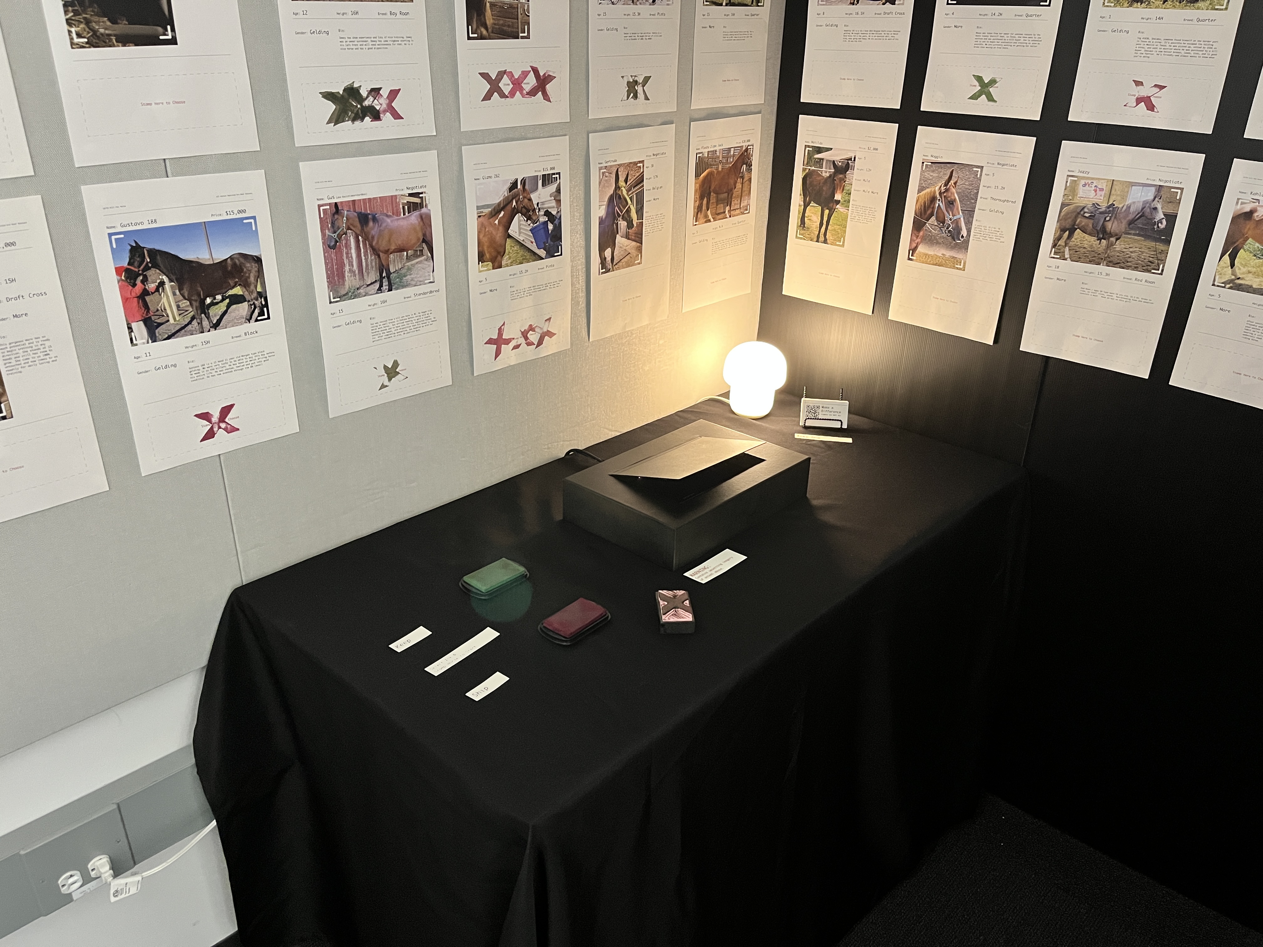 I started off this project with a ton of research. All the information on the walls are of real kill pen horses I found being sold online. After collecting data, I started making my informational videos using real photos from the industry. I then took the videos and made a code to play it when my pressure plates (hidden under the ink trays) are stamped. I also carved my own stamp to make the installation more interactive.